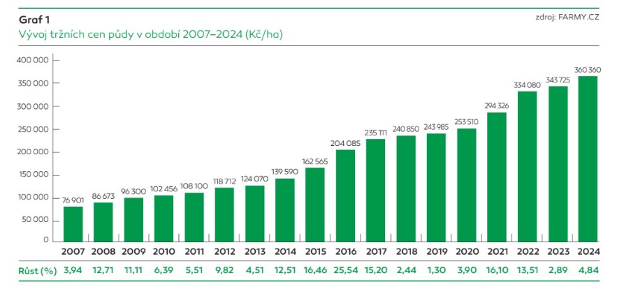 Jen pro představu: pokud jste roce 2023 vlastnili 1 hektar půdy, tak její hodnota byla v průměru 343 725,- Kč. O rok později to už bylo 360 360,- Kč. Meziroční nárůst byl tedy o cca 5%. Což není vůbec špatné.